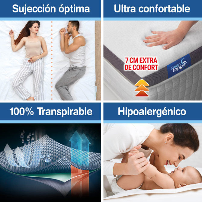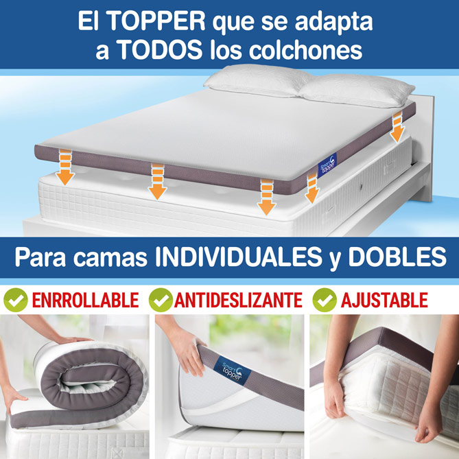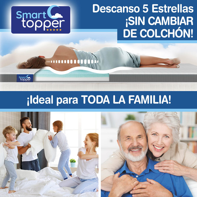 ¿Quieres volver a dormir del tirón cada noche y despertarte con las pilas totalmente cargadas? Ahora hay una forma más sencilla y asequible de conseguir el descanso que necesitas, con SMART Topper: el innovador Topper diseñado para transformar tu viejo colchón en el sistema de descanso de tus sueños. ¡Y sin gastarte una fortuna para estrenar colchón! SMART Topper renovará tu cama al instante: ¡7 cm extra de confort que convertirán tu cama en la de un Hotel de 5 Estrellas!
