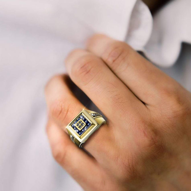 La magia de Boston –una ciudad viva, emergente, admirada– ha inspirado este fabuloso Anillo. Un clásico Sello de caballero con un audaz diseño y materiales realmente innovadores en la Alta Joyería masculina: Diamantes negros, talla brillante, y Zafiros. En total, medio Quilate de las Piedras Preciosas más cotizadas sobre Oro de 9K. La composición es sublime, un “skyline” de deslumbrante luz y favorecedores colores –elegante dorado, azul profundo, negro intenso...– hecho por y para ti, un “dandy” de espíritu urbano.