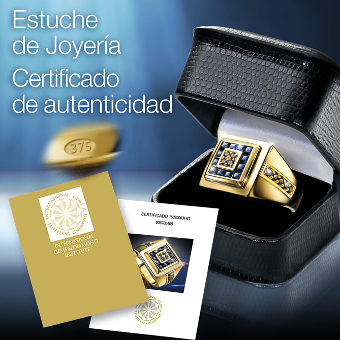 El Anillo BOSTON se entrega en un estuche de joyería con su Certificado de Autenticidad expedido por el International Gems & Diamond Institute, que garantiza la calidad de los Diamantes negros y Zafiros utilizados. El Anillo lleva su correspondiente contraste oficial que garantiza la pureza del Oro de 9K (375 milésimas) según el Laboratorio de Ensayo y Contraste de Objetos de Metales Preciosos.