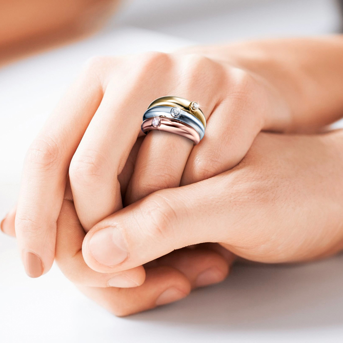 El Anillo ETERNAL GOLD cobra vida con los materiales más cotizados y un espectacular diseño: Diamantes -”los mejores amigos de la mujer”, como los definió la inmortal Marilyn Monroe- y tres elegantes aros tricolor de Plata de 1ª Ley chapada en Oro de 1ª Ley -en tonos amarillo, blanco y rosa- fundidos en un romántico abrazo. Tres veces impecable, sus líneas son poesía e iluminarán cada gesto de tus manos con el fulgor de sus 3 Diamantes talla brillante en la cúspide de las Alianzas. Para que estés eternamente bella.
