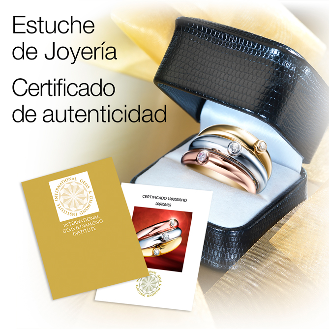 El Anillo ETERNAL GOLD se entrega en un elegante estuche de Joyería, acompañado de su Certificado de Autenticidad, expedido por el International Gems & Diamond Institute, que garantiza la calidad y autenticidad de los Diamantes empleados en su creación. Además, lleva su correspondiente contraste oficial del Laboratorio de Ensayo y Contraste de Objetos de Metales Preciosos que garantiza la pureza de la Plata de 1ª Ley -a la que se ha aplicado un chapado en Oro de 1ª Ley de Alta Joyería, de la mejor calidad para asegurar su brillo inalterable-.