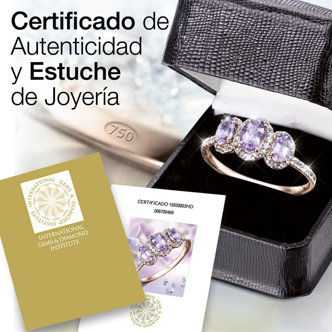 El Anillo La Joya del Amor se entrega en su estuche de joyería con su Certificado de Autenticidad expedido por el International Gems & Diamond Institute, que garantiza la calidad y autenticidad de las Amatistas ”Rosa de Francia” y los Topacios utilizados en su creación. Además, lleva su correspondiente contraste oficial, que garantiza la pureza del Oro de 1ª Ley según el Laboratorio de Ensayo y Contraste de Objetos de Metales Preciosos.