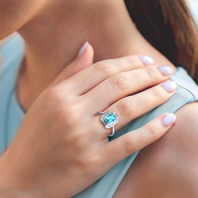 ¿Te has fijado? Las mujeres más elegantes del espectáculo y la Realeza eligen para sus apariciones una Piedra Preciosa que irradia misterio, lujo y sofisticación: la Aguamarina. De inconfundible color azul pálido, que recuerda al mar, y tornasolados reflejos, es protagonista de este Anillo: un gran Solitario de Aguamarina de más de 1 Quilate, en favorecedora talla Esmeralda y engaste en garra, enmarcado con un sinfín de luminosos Diamantes, de pureza y calidad superior. La composición, realizada sobre Oro blanco de 1ª Ley, es sublime.