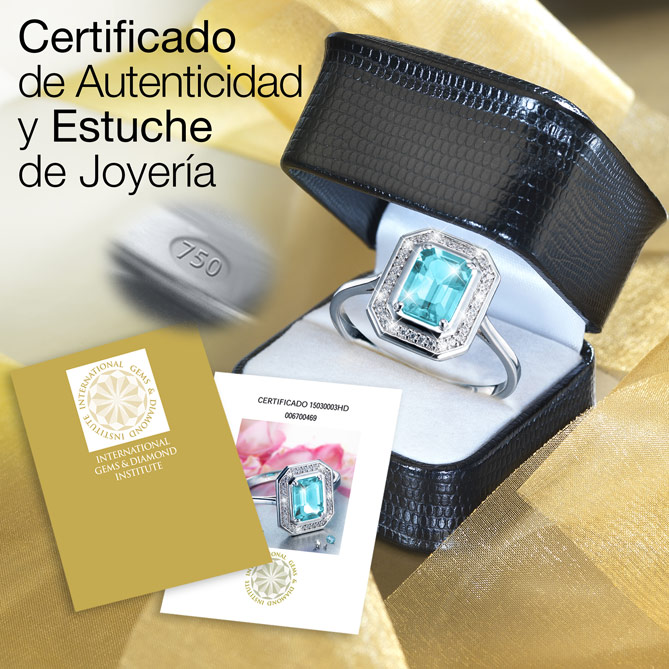 El Anillo LUJO AGUAMARINA se entrega en un estuche de Joyería con su Certificado de Autenticidad expedido por el International Gems and Diamond Institute, que garantiza la calidad y autenticidad de la Aguamarina y los Diamantes utilizados en su creación. Además, lleva su correspondiente contraste oficial, que garantiza la pureza del Oro blanco de 1ª Ley según Laboratorio de Ensayo y Contraste de Objetos de Metales Preciosos.