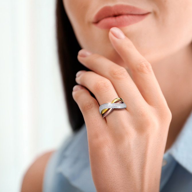 LUJO INFINITO enamora por su diseño de Alta Joyería en Plata de 1ª Ley, con un impecable chapado en los 3 tipos de Oro de 1ª Ley más cotizados -amarillo, rosa y blanco- que se entrelazan sobre tu mano… No tendrás que conformarte con un solo deseo, ¡ahora podrás pedir 3! El Oro amarillo es un clásico imprescindible: el Oro rosa es la última tendencia; y el Oro blanco, de pureza sobresaliente, añade un toque de modernidad... 3 tonos de Oro de 1ª Ley, una alquimia de perfecta armonía que atraerá todas las miradas.