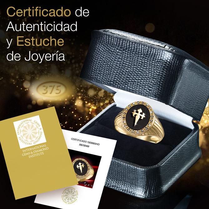 El Anillo ORDEN DE SANTIAGO se entrega en un estuche de joyería con su Certificado de Autenticidad expedido por el International Gems & Diamond Institute, que garantiza la calidad de los Diamantes negros y el Ónice utilizados. El Anillo lleva su correspondiente contraste oficial que garantiza la pureza del Oro de 9K (375 milésimas) según el Laboratorio de Ensayo y Contraste de Objetos de Metales Preciosos.