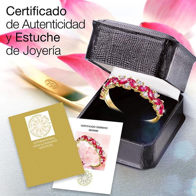 El Anillo Rivière de Rubíes se entrega en un estuche de joyería con su Certificado de Autenticidad expedido por el International Gems and Diamond Institute, que garantiza la calidad y autenticidad de los Rubíes y Topacios utilizados en su creación. Además, lleva su correspondiente contraste oficial, que garantiza la pureza del Oro de 1ª Ley según el Laboratorio de Ensayo y Contraste de Objetos de Metales Preciosos.