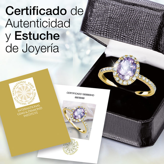 El Anillo ROSA DE FRANCIA se entrega en un estuche de joyería con su Certificado de Autenticidad expedido por el International Gems and Diamond Institute, que garantiza la calidad y autenticidad de la Amatista y los Topacios utilizados en su creación. Además, lleva su correspondiente contraste oficial del Laboratorio de Ensayo y Contraste de Objetos de Metales Preciosos, que garantiza la pureza de la Plata de 1ª Ley -a la que se ha aplicado un chapado de Oro amarillo de 1ª Ley de Alta Joyería, de la mejor calidad para asegurar su brillo inalterable-.