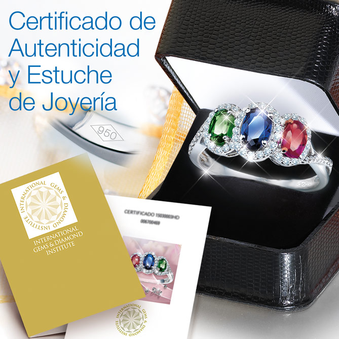El Anillo SUEÑO DE PLATINO se entrega en un estuche de joyería con su Certificado de Autenticidad expedido por el International Gems and Diamond Institute, que garantiza la calidad y autenticidad del Zafiro, la Esmeralda, el Rubí y los Topacios utilizados en su creación. Además, lleva su correspondiente contraste oficial, que garantiza la pureza del Platino de Ley según el Laboratorio de Ensayo y Contraste de Objetos de Metales Preciosos.