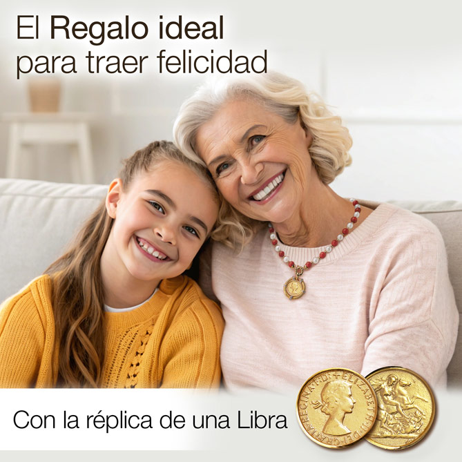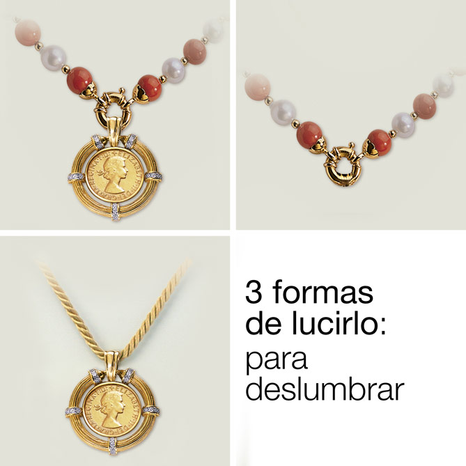 Para ti, que te gustan las Joyas con “alma”, llega el Collar LIBRA DE ORO: una bellísima creación que tiene como protagonista a una de las monedas más importantes del mundo… Realizado con cuentas de Plata de 1ª Ley bañada en Oro de 1ª Ley, Perlas de Mallorca y Coral Bambú, del Collar pende una preciosa medalla con la réplica de una Libra, trabajada hasta el mínimo detalle: la efigie de la Reina Isabel II de Inglaterra en el anverso, San Jorge a caballo luchando contra un dragón en el reverso como alegoría del triunfo del bien sobre el mal… Acuñada en Plata de 1ª Ley bañada en Oro de 1ª Ley, esta moneda está engarzada en un grueso aro, realizado con los mismos materiales, que, además, se ha embellecido con 5 Diamantes, talla brillante… ¡Es fabulosa! La Joya que querrás lucir siempre, sea cual sea tu edad y estilo: por su estética, por su versatilidad –su diseño exclusivo permite llevarla de 3 formas diferentes– y por su simbolismo –regalar una Libra de Oro es una tradición universal para expresar los mejores deseos de felicidad–.