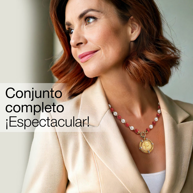 El Collar LIBRA DE ORO enamora por el valor de sus materiales -Diamantes talla brillante, Perlas de Mallorca, Coral Bambú y Plata de 1ª Ley bañada en Oro de 1ª Ley- y por su simbolismo: con un espectacular Colgante cuyo protagonista es la hermosa réplica de una Libra, esta sublime Joya rinde homenaje a la bella tradición europea de regalar, en las ocasiones especiales, una moneda valiosa como deseo de buena suerte y prosperidad... Elegante, versátil –podrás llevarlo de 3 formas distintas–, es un lujo a tu alcance para darte un merecido “capricho” o hacer un Regalo que se lleva en el corazón…