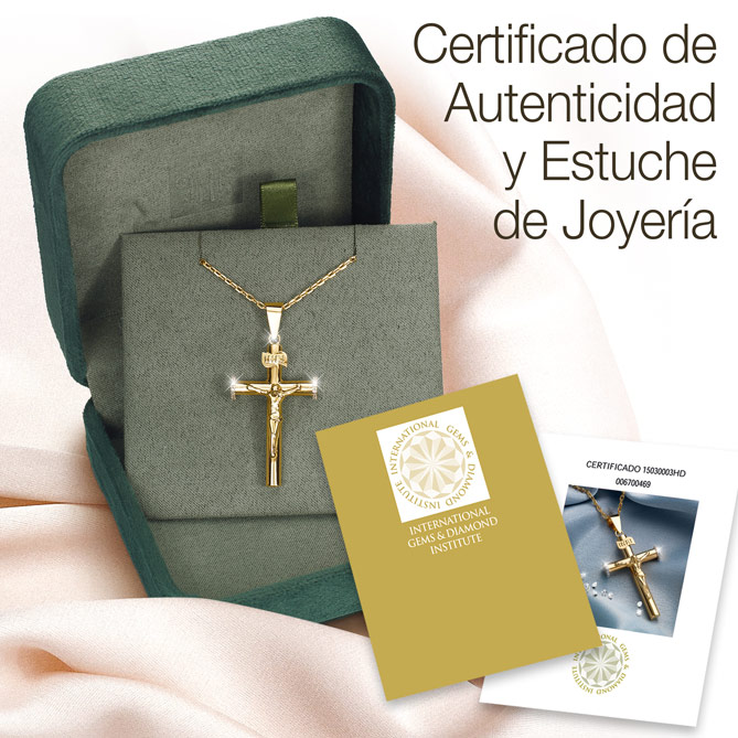 La Cruz ESENCIA y su Cadena a juego se entregan en un elegante estuche de Joyería, acompañadas de su Certificado de Autenticidad, expedido por el International Gems & Diamond Institute, que garantiza la calidad y autenticidad de los Diamantes empleados en su creación. Lleva además su correspondiente contraste oficial que garantiza la pureza del Oro de 1ª Ley según el Laboratorio de Ensayo y Contraste de Objetos de Metales Preciosos.