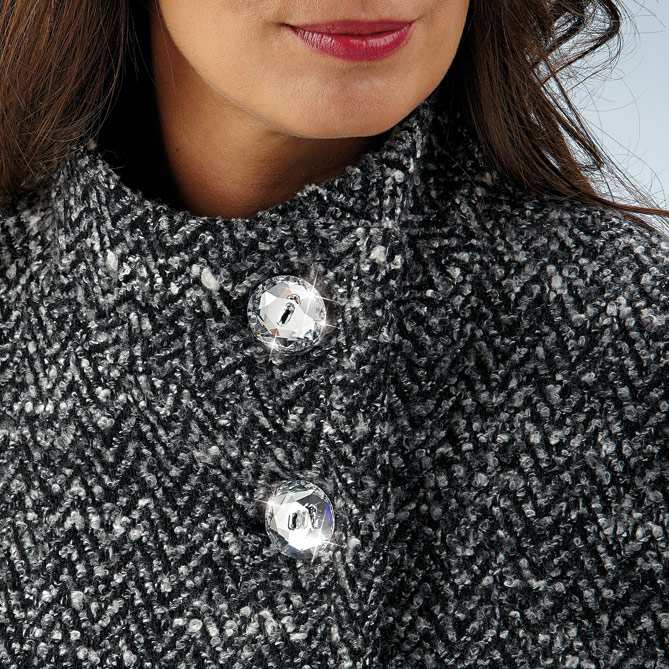 Lino Corelli ha escogido el patronaje de la capa clásica, con el vuelo y el largo perfecto para adaptarse a todo tipo de mujer, sea cual sea su talla o estatura. El toque de lujo lo ponen los dos grandes botones de cristal de Swarosvki, tallados como diamantes.
