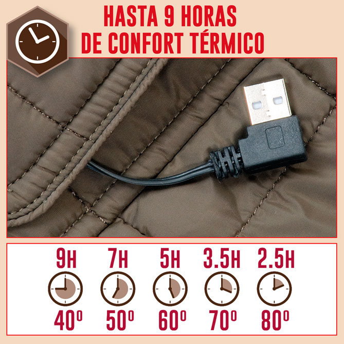 CALOR A MEDIDA ¡CON SÓLO PULSAR UN BOTÓN! Podrás conectar o desconectar a tu gusto el sistema de calefacción integrado, eligiendo entre sus 5 niveles de calor el más confortable en cada momento. ¡Así de fácil es adaptarse a los cambios de tiempo repentinos del otoño o la primavera con esta Chaqueta Calefactable!