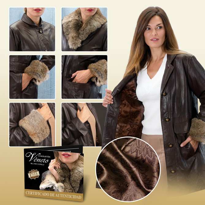 Lino Corelli ha creado el Chaquetón Veneto para vestir de lujo a la mujer actual. Una prenda exclusiva realizada con auténtica piel de cordero, una de las pieles que, por su flexibilidad y ligereza, mejor se amolda al cuerpo. El cuello y puños desmontables de pelo de conejo lo convierten en una pieza llena de versatilidad.