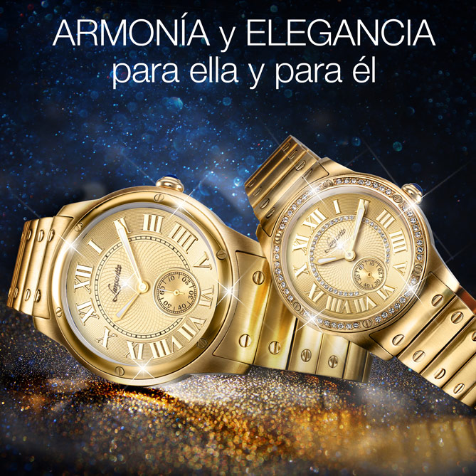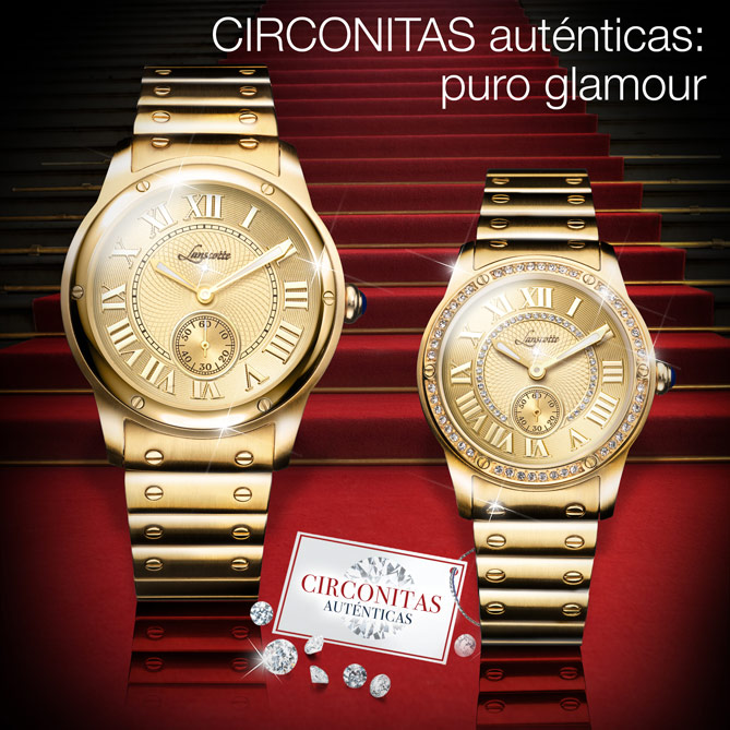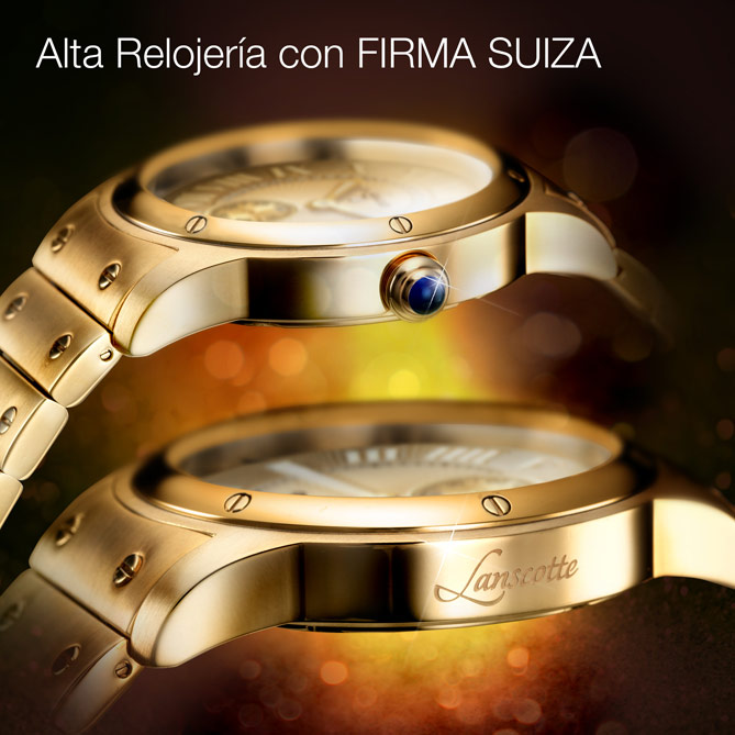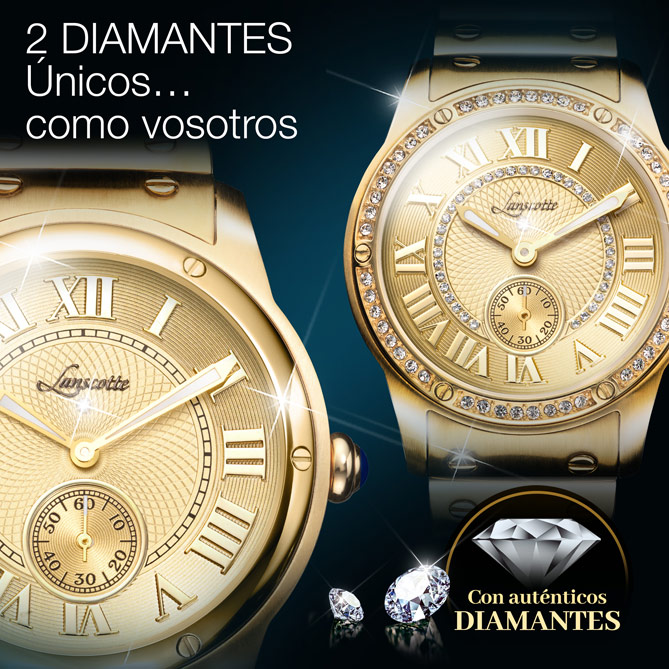La firma suiza Lanscotte lo ha vuelto hacer: pensar en ti, en tus gustos y aspiraciones, para ofrecerte una espectacular Pareja de Relojes. UNIQUE, para señora y caballero, enamoran por su diseño de aire clásico -la maravillosa esfera, dorada y con grandes numerales romanos, es un icono de la Alta Relojería- que cobra vida con materiales de lujo: Acero bañado en Oro de 1ª Ley IPG de brillo inalterable, un Diamante en cada Reloj y un sinfín de preciosas Circonitas en el modelo femenino. Son únicos y son vuestros: los merecéis.