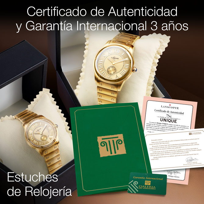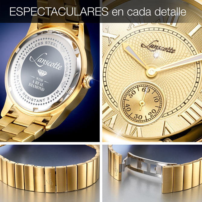 Hay relojes que son parte de la historia, deseados y admirados. Los Relojes UNIQUE rinden homenaje a estas obras maestras, con un diseño clásico en Acero bañado en Oro de 1ª Ley IPG en el que destacan sus esferas doradas con grandes numerales romanos, también dorados. Con UNIQUE llevaréis 2 creaciones distintivas, cuajadas de detalles: dial con triple guilloché –una compleja técnica reservada solo a las grandes marcas– personalizado con el Logotipo de Lanscotte, bajo el que brillan 2 Diamantes auténticos; extremo de la corona en precioso color azul cobalto; subesfera Petit Second; cristal de alta resistencia; grabados de la marca que aportan prestigio; 86 Circonitas –prácticamente indistinguibles de los Diamantes– iluminando el modelo de señora; doble bisel embellecido con tornillería, al igual que los primeros eslabones del brazalete; agujas con acabado luminiscente visible en la oscuridad... ¡Son irresistibles!