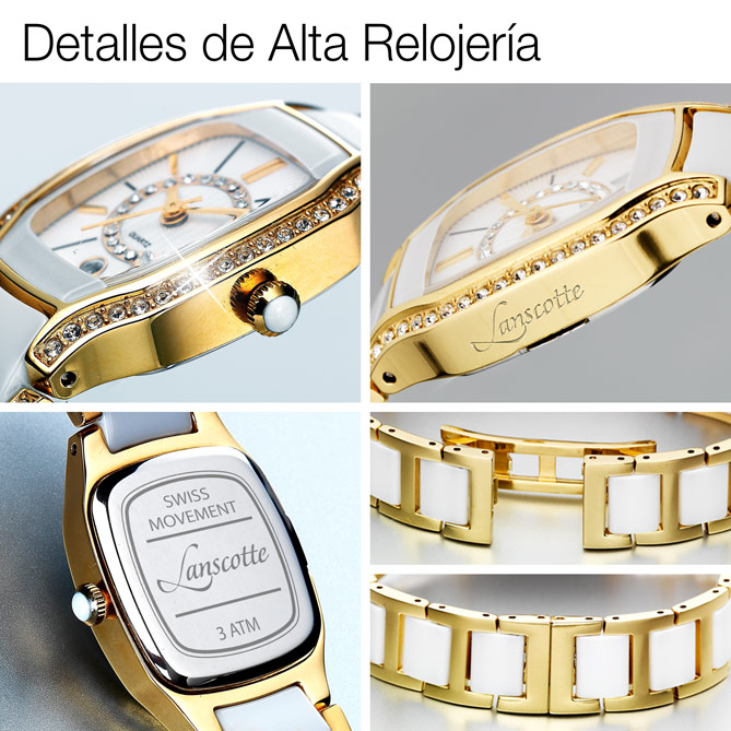 BIANCA Ceramic es una obra de arte de Alta Relojería de la prestigiosa firma suiza Lanscotte. La sofisticada belleza de la Cerámica blanca de alta resistencia –tan resistente como el Diamante– y su diseño de lujo, iluminado por la magia de más de 200 cristales de Swarovski y el baño en Oro de 1ª Ley, te seducirá… Su corazón, con maquinaria suiza, marcará un tiempo preciso, único…