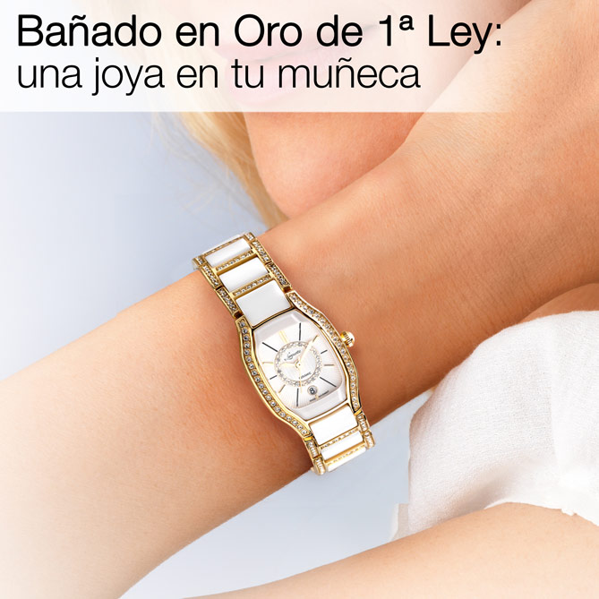 Cuidado al máximo: desde las exquisitas líneas de su caja, perfectamente integrada en el brazalete… El dial embellecido con guilloché en relieve y ventana de calendario… Y, para darle su brillo incomparable, 220 auténticos cristales de Swarovski iluminando el original brazalete de eslabones de Cerámica blanca, el dial, el bisel... Exclusivos detalles, como los grabados de la marca, el cristal de alta resistencia, el minucioso acabado dorado mediante baño de Oro de 1ª Ley… Y, en su interior, un preciso mecanismo de cuarzo suizo para garantizar la total exactitud... BIANCA Ceramic es el regalo perfecto para las mujeres de todas las edades que saben brillar cada día: es perfecto para ti.