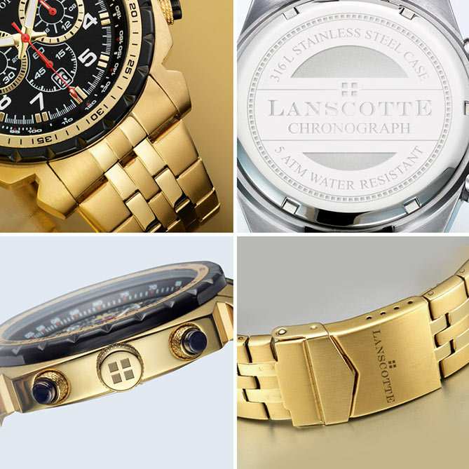 Creado por la prestigiosa firma suiza Lanscotte con Acero Quirúrgico acabado en Oro de Primera Ley, el Reloj Cronógrafo London responde a la perfección a las exigencias de calidad, diseño y elegancia del hombre que sabe aprovechar cada minuto de su tiempo.