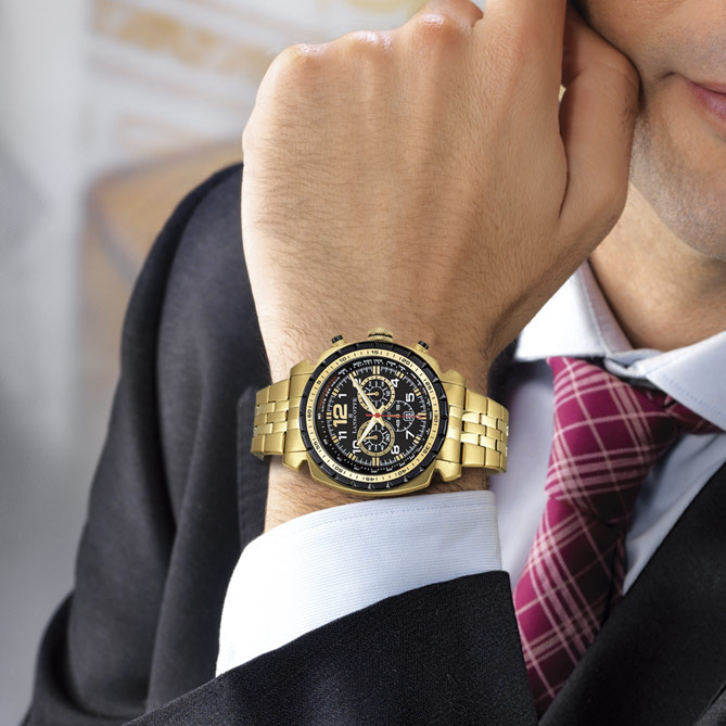 Un modelo sofisticado creado enteramente en Acero Quirúrgico acabado en Oro de 1ª Ley mediante tratamiento IPG que garantiza un mayor brillo y durabilidad… Y una maquinaria de alta precisión con un potente mecanismo de cuarzo con función cronógrafo.