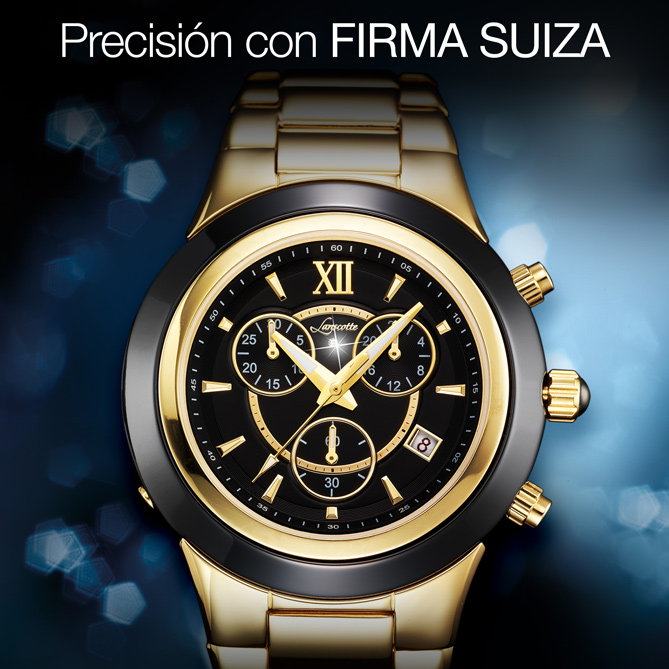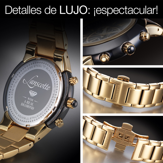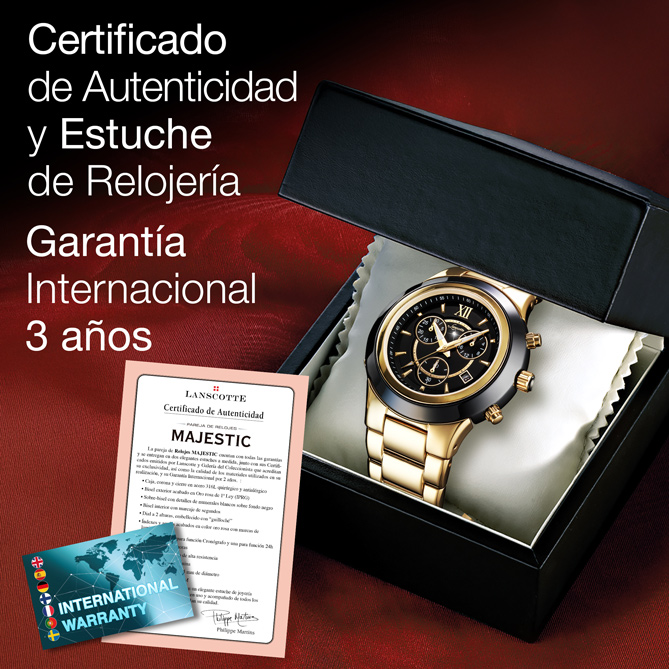 Llevar hoy Reloj es una muestra de estilo y personalidad. Especialmente si es como MAJESTIC: de espectacular diseño –con 3 subesferas para su función Cronógrafo que le dan un atractivo aire deportivo–, su corazón late con la emblemática precisión que sólo una firma suiza como Lanscotte puede imprimir a sus creaciones. Un hito de la Alta Relojería que cobra vida con los materiales más valiosos e innovadores: Cerámica negra, Acero bañado en Oro de 1ª Ley IPG y 1 Diamante. Es normal que lo quieras tener… ¡sobre todo a su increíble precio!