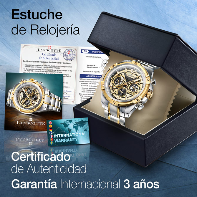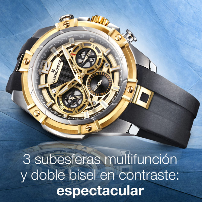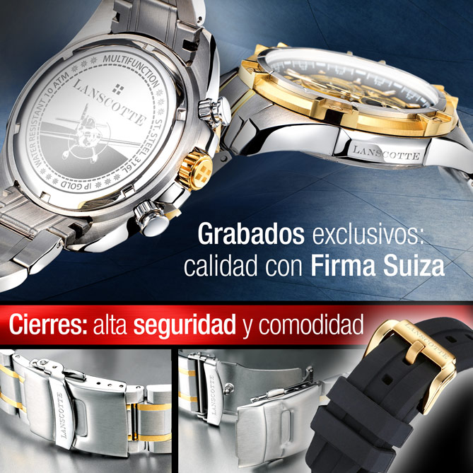 Si tu vida, tu estilo y tu día a día no siempre son los mismos ¿por qué no escoger un Reloj que se adapte a ti en cada momento? No renuncies a tu versatilidad -¡ni a tu gusto por la moda!- y elige el Reloj de la firma suiza Lanscotte más original e innovador… Porque TECNO DUAL es elegante con su brazalete en resistente Acero 316L, Quirúrgico y Antialérgico con baño selectivo de Oro de 1ª Ley IPG... Es deportivo, cuando escoges su estilizada correa de silicona negra… Y, sobre todo, es vanguardista siempre: con sus 3 esferas multifunción, su espectacular dial en dos niveles y, por supuesto, con la proverbial precisión de la firma suiza Lanscotte... Elige tu Reloj como tu estilo de vida: para disfrutarlo en cada momento…