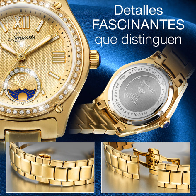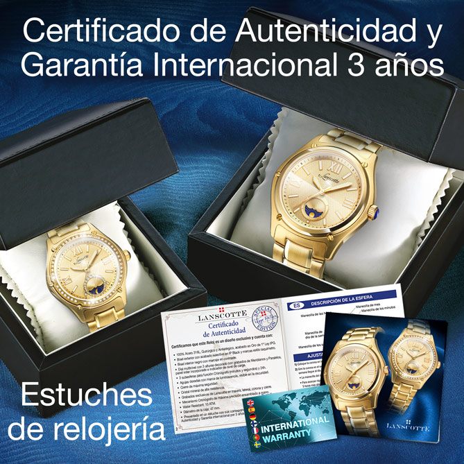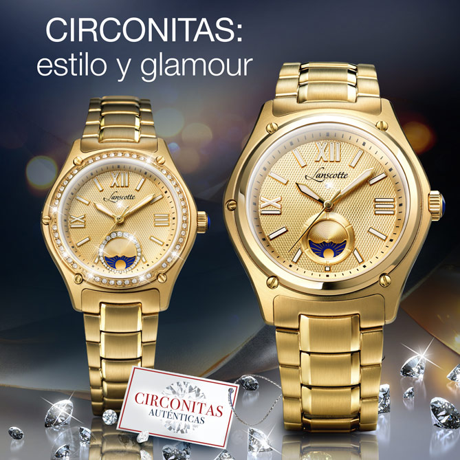 A lo largo de su historia, Lanscotte ha puesto de relieve su maestría artesanal. Un legado en la fabricación de relojes de lujo que ha ido incluyendo las complicaciones relojeras más exclusivas, los materiales más valiosos…. Esta fusión de técnica y estilo ha dado frutos excepcionales, como los Relojes LUX DORÉE. De diseño clásico, en resistente Acero 316L, Quirúrgico y Antialérgico -el mejor-, y bañados en Oro de 1ª Ley IPG -el tratamiento por ionización que garantiza su brillo inalterable-, en sus esferas doradas destaca el indicador de la función noche/día, la complicación relojera de alta gama que los distingue y, en el modelo de señora, las 51 brillantes Circonitas que lo enmarcan. ¡Irresistible!