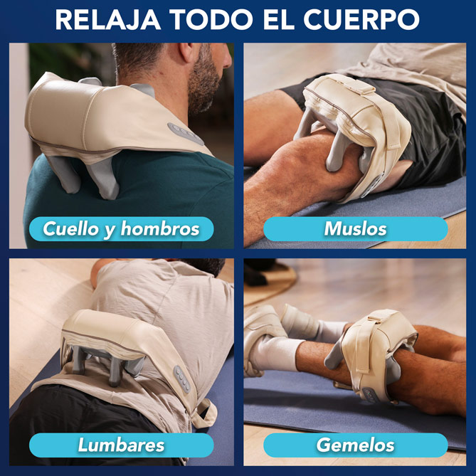 El masajeador Real Pro utiliza rodillos de amasamiento profundo que se mueven en suaves movimientos circulares, mientras sus nodos imitan la presión de los dedos humanos. El resultado es un masaje intenso, pero reconfortante que afloja los músculos tensos, libera el estrés acumulado y te ayuda a desconectar por completo.
