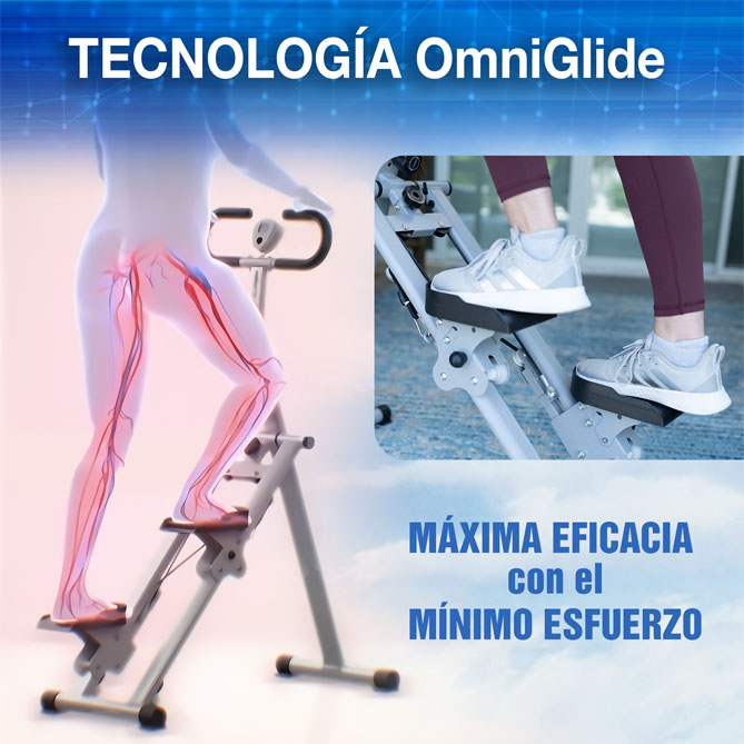 Si te cuesta encontrar tiempo para ir al gimnasio y cuando vas, no consigues los resultados esperados, Step Climber es la solución. Es mejor que caminar, montar en bici, la elíptica y cualquier otro tipo de entrenamiento agotador. Gracias a la tecnología inteligente OmniGlide, se sincroniza con tu cuerpo para distribuir el esfuerzo de forma uniforme, activando piernas, glúteos, tronco y brazos con un movimiento natural que te hará sentir como si flotaras. Con solo 15 minutos al día, quemas calorías, tonificas y mejoras tu resistencia cardiovascular sin fatiga y sin impacto en las articulaciones. ¡Nunca ha sido tan fácil conseguir los mejores resultados!